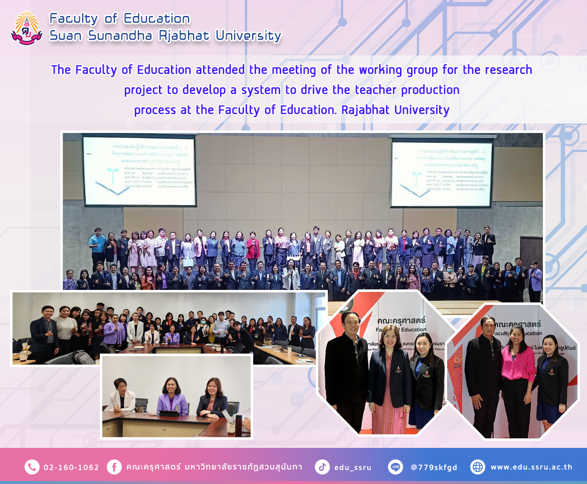 On March 7-8, 2024, led by Assistant Professor Dr. Kannika Piromrat, Dean of the Faculty of Education. Assistant Professor Dr.Tasanee Satthaphong, Deputy Dean for Academic Affairs Assistant Professor Panuwat Sivaskunraj, Head of the Teaching Profession Group, and Thidadow Dechsri, Head of the Thai Language Department, Faculty of Education, Suan Sunandha Rajabhat University. I attended a meeting of the working group for the research project to develop a system to drive the teacher production process in the Faculty of Education. Rajabhat University at Valaya Alongkorn Rajabhat University under the Royal Patronage