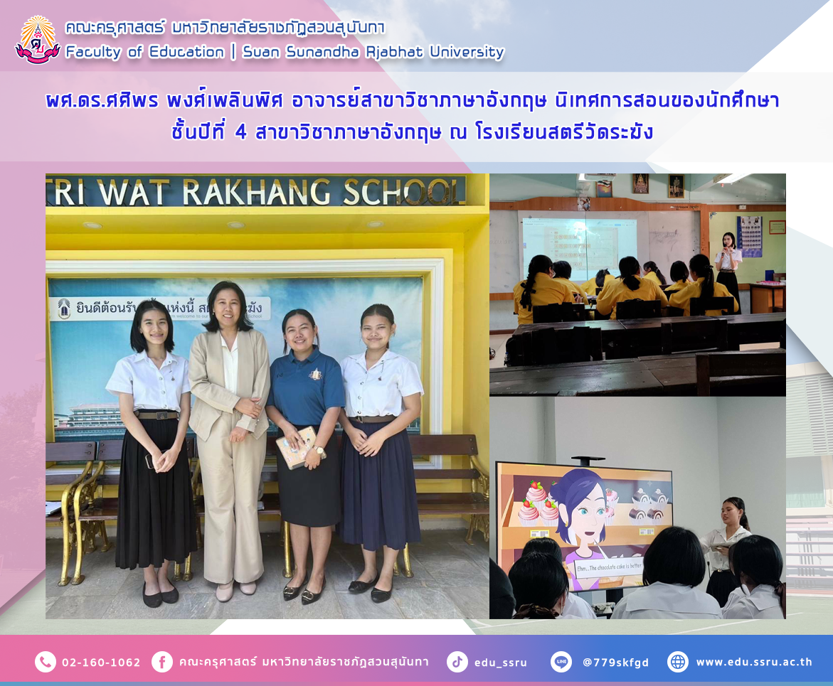 เมื่อวันที่ 19 มิถุนายน 2567 ผู้ช่วยศาสตราจารย์ ดร.ศศิพร พงศ์เพลินพิศ อาจารย์สาขาวิชาภาษาอังกฤษ คณะครุศาสตร์ มหาวิทยาลัยราชภัฏสวนสุนันทา นิเทศการสอนนักศึกษาชั้นปีที่ 4 ณ โรงเรียนสตรีวัดระฆัง