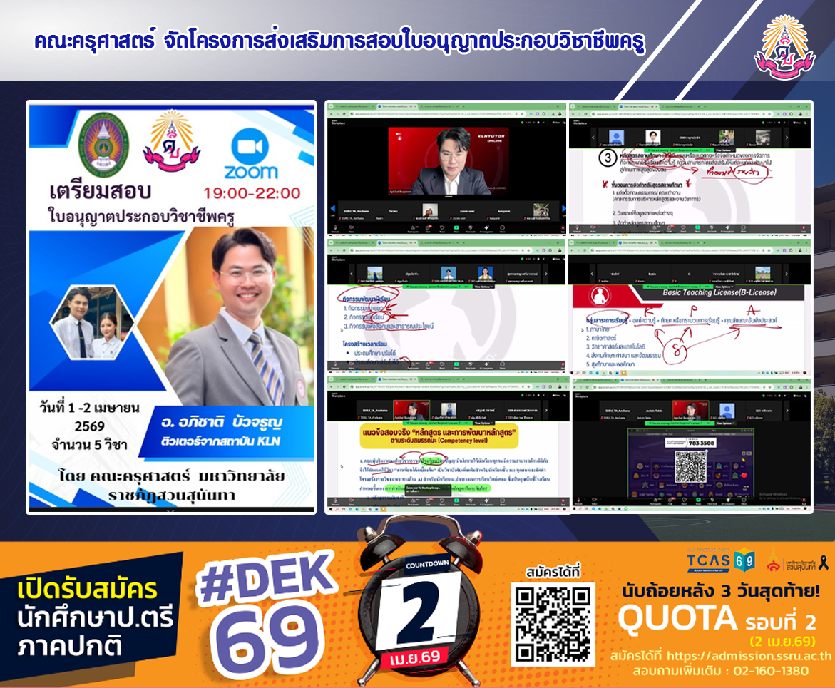 วันที่ 1 - 2 เมษายน 2569 เวลา 19.00 - 22.00 น. คณะครุศาสตร์ มหาวิทยาลัยราชภัฏสวนสุนันทา จัดโครงการส่งเสริมการสอบใบอนุญาตประกอบวิชาชีพครู โดยมีรองคณบดีฝ่ายวิชาการ ผู้ช่วยศาสตราจาย์ ดร.ทัศนีย์ เศรษฐพงษ์ รองคณบดีฝ่ายวิชาการ กล่าวเปิดโครงการดังกล่าว วัตถุประสงค์ของโครงการเพื่อส่งเสริมสมรรถนะด้านการปฏิบัติงานวิชาชีพครู วิทยากร อาจารย์อภิชาติ บัวจรูญ จากสถาบัน KLN ในรูปแบบออนไลน์