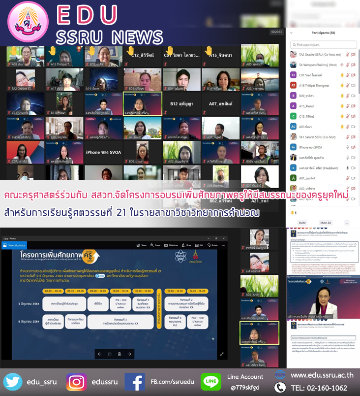 วันที่ 5 มิถุนายน 2564 คณะครุศาสตร์ มหาวิทยาลัยราชภัฏสวนสุนันทา ร่วมกับ สสวท. จัดโครงการอบรมเพิ่มศักยภาพครูให้มีสมรรถนะของครูยุคใหม่สำหรับการเรียนรู้ศตวรรษที่ 21 สาขาวิชาวิทยาการคำนวณ ระหว่างวันที่ 5-6 มิถุนายน 2564 โดยเปิดอบรมทั้ง 3 รายวิชา ได้แก่ วิชาวิทยาการคำนวณ วิชาคณิตศาสตร์ และวิชาวิทยาศาสตร์ ผ่านระบบออนไลน์