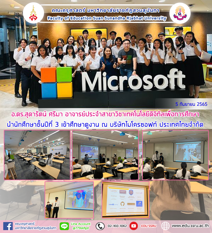 เมื่อวันที่ 2 กันยายน 2565 อาจารย์ ดร.สุดารัตน์ ศรีมา อาจารย์ประจำสาขาวิชาเทคโนโลยีดิจิทัลเพื่อการศึกษา คณะครุศาสตร์ มหาวิทยาลัยราชภัฏสวนสุนันทา นำนักศึกษาชั้นปีที่ 3 เข้าศึกษาดูงานบริษัท ไมโครซอฟท์ ประเทศไทยจำกัด ภายใต้โครงการ " โครงการศึกษาดูงานแหล่งเรียนรู้ทางเทคโนโลยี " โดยได้รับเกียรติ นางสาวศิรินุช ศรารัชต์ นายเด่นชัย พันธุ์เกตุ และ นายอาจารย์นพดล รัตนวิเศษรัตน์ โดยมีการบรรยายในหัวข้อ "ไมโครซอฟท์กับการใช้มัลติมีเดียในการศึกษา" "เครื่องมือที่ใช้ในการสร้างสรรค์งานกราฟฟิกในการศึกษา" และ "ประสบการณ์ในการใช้ไมโครซอฟท์ (ถาม – ตอบ)" ณ บริษัทไมโครซอฟท์ ประเทศไทยจำกัด