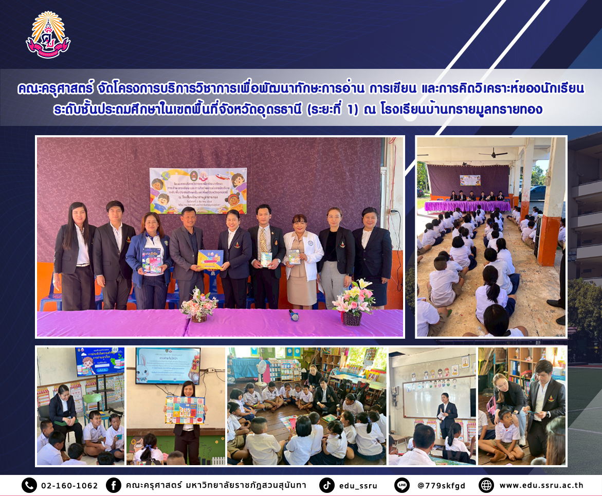 เมื่อวันที่ 2 ธันวาคม 2568 คณะครุศาสตร์ มหาวิทยาลัยราชภัฏสวนสุนันทา ได้ลงพื้นที่จัดกิจกรรม โครงการบริการวิชาการเพื่อพัฒนาทักษะการอ่าน การเขียน และการคิดวิเคราะห์ ระยะที่ 1 ณ โรงเรียนบ้านทรายมูลทรายทอง จังหวัดอุดรธานี เมื่อวันที่ 2 ธันวาคม 2568 โดยมุ่งพัฒนาความสามารถด้านภาษา การคิดเชิงวิเคราะห์ และการสื่อสารของนักเรียนระดับประถมศึกษาตอนปลาย