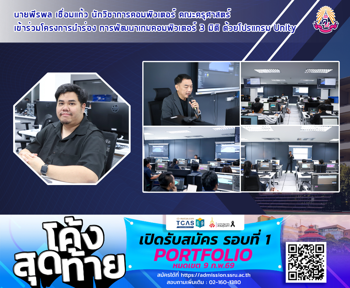 เมื่อวันที่ 4-5 กุมภาพันธ์ 2569 นายพีรพล เชื่อมแก้ว นักวิชาการคอมพิวเตอร์ คณะครุศาสตร์ มหาวิทยาลัยราชภัฏสวนสุนันทา เข้าร่วมโครงการนำร่อง “การพัฒนาเกมคอมพิวเตอร์ 3 มิติ ด้วยโปรแกรม Unity” เพื่อส่งเสริมทักษะด้านการออกแบบและพัฒนาเกมดิจิทัลเชิงปฏิบัติ โดยได้รับเกียรติจาก ผู้ช่วยศาสตราจารย์ ดร.เกษม กมลชัยพิสิฐ สาขาวิชาแอนิเมชัน เกม และดิจิทัลมีเดีย คณะวิทยาศาสตร์และเทคโนโลยี มหาวิทยาลัยราชภัฏบ้านสมเด็จเจ้าพระยา และบรรณาธิการวารสารแอนิเมชัน เกม ดิจิทัลมีเดียและเทคโนโลยี เป็นวิทยากรถ่ายทอดองค์ความรู้เชิงลึก ตั้งแต่พื้นฐานการออกแบบเกมสามมิติ การใช้งานเครื่องมือใน Unity ไปจนถึงกระบวนการพัฒนาเกมอย่างเป็นระบบ ณ ห้องปฏิบัติการคอมพิวเตอร์ 3122