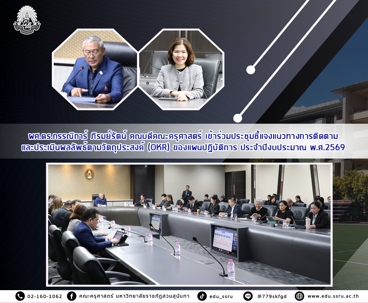 เมื่อวันที่ 6 พฤศจิกายน 2568 นำโดย ผู้ช่วยศาสตราจารย์ ดร.กรรณิการ์ ภิรมย์รัตน์ คณบดีคณะครุศาสตร์ มหาวิทยาลัยราชภัฏสวนสุนันทา พร้อมด้วยรองคณบดีทุกฝ่าย เข้าร่วมประชุมชี้แจงแนวทางการติดตามและประเมินผลลัพธ์ตามวัตถุประสงค์ (OKR) ของแผนปฏิบัติการ ประจำปีงบประมาณ พ.ศ.2569 ณ ห้องประชุมสภามหาวิทยาลัย ชั้น 5 อาคาร 31 มหาวิทยาลัยราชภัฏสวนสุนันทา และในรูปแบบออนไลน์