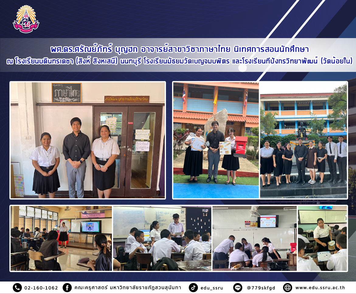 เมื่อวันที่ 28 พฤศจิกายนและ 4 ธันวาคม 2568 ผู้ช่วยศาสตราจารย์ ดร.ศรัณย์ภัทร์ บุญฮก อาจารย์สาขาวิชาภาษาไทย คณะครุศาสตร์ มหาวิทยาลัยราชภัฏสวนสุนันทา นิเทศการสอนนักศึกษาสาขาวิชาภาษาไทย ณ โรงเรียนบดินทรเดชา (สิงห์ สิงหเสนี) นนทบุรี โรงเรียนมัธยมวัดเบญจมบพิตร และโรงเรียนทีปังกรวิทยาพัฒน์ (วัดน้อยใน)