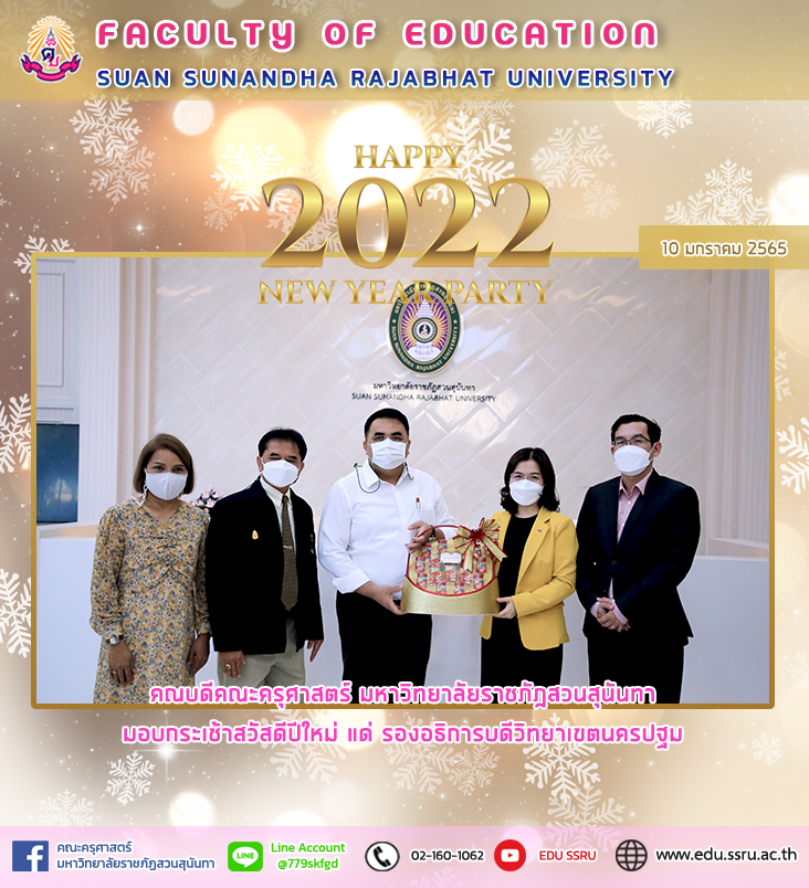 วันที่ 10 มกราคม 2565 ผู้ช่วยศาสตราจารย์ ดร.กรรณิการ์ ภิรมย์รัตน์ คณบดีคณะครุศาสตร์ มหาวิทยาลัยราชภัฏสวนสุนันทา มอบกระเช้าสวัสดีปีใหม่ แด่ ผู้ช่วยศาสตราจารย์ ดร. คมสัน โสมณวัตร รองอธิการบดีวิทยาเขตนครปฐม มหาวิทยาลัยราชภัฏสวนสุนันทา
