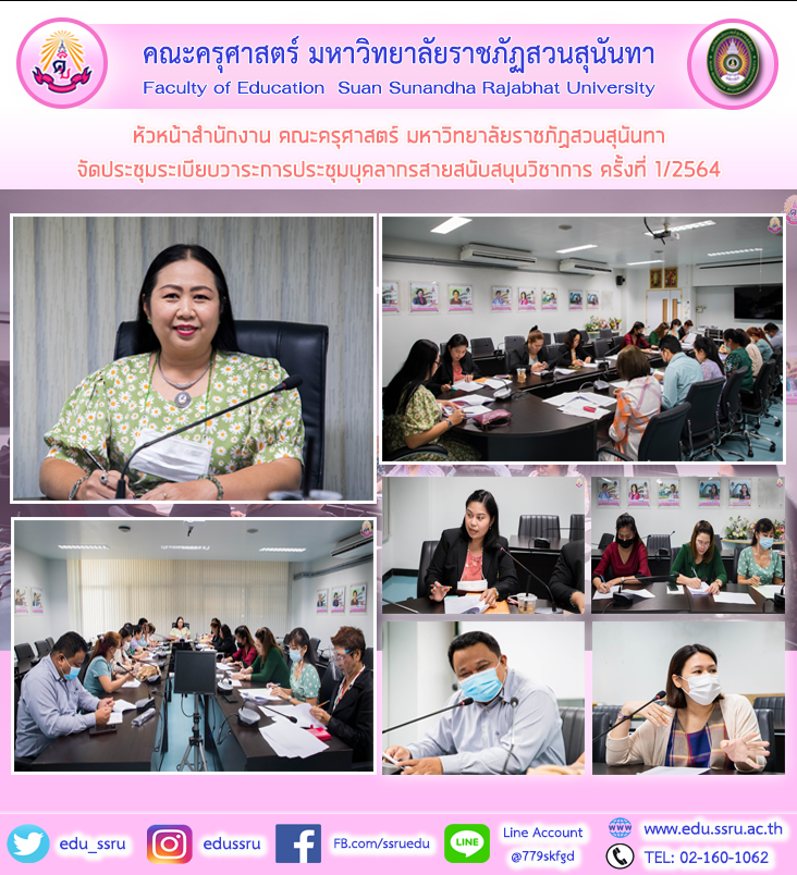 วันที่ 10 มีนาคม 2564 นางรวินันท์ พระยาน้อย หัวหน้าสำนักงาน คณะครุศาสตร์ มหาวิทยาลัยราชภัฏสวนสุนันทา จัดประชุมระเบียบวาระการประชุมบุคลากรสายสนับสนุนวิชาการ ครั้งที่ 1/2564 ชี้แจงและรายงานติดตามตัวชี้วัดต่างๆของคณะฯ ณ ห้องประชุม 1124 คณะครุศาสตร์