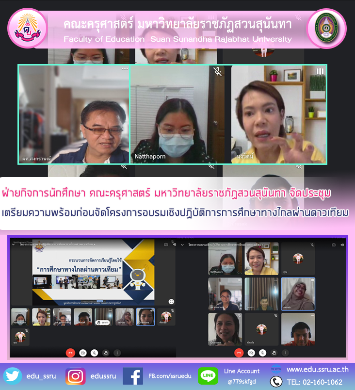 วันที่ 10 พฤษภาคม 2564 นำโดย ผู้ช่วยศาสตราจารย์สงกรานณ์ ขุนทิพย์ทอง รองคณบดีฝ่ายกิจการนักศึกษา คณะครุศาสตร์ มหาวิทยาลัยราชภัฏสวนสุนันทา จัดประชุมเตรียมความพร้อมก่อนจัดโครงการอบรมเชิงปฏิบัติการการศึกษาทางไกลผ่านดาวเทียม ซึ่งกำหนดจัดโครงการวันที่ 12 พฤษภาคม 2564 ให้กับนักศึกษาครูคืนถิ่นชั้นปีที่ 4