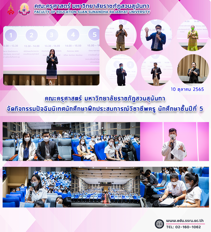 วันศุกร์ที่ 7 ตุลาคม 2565 เวลา 13.30 - 16.00 น. คณะครุศาสตร์ มหาวิทยาลัยราชภัฏสวนสุนันทา จัดกิจกรรมปัจฉิมนิเทศนักศึกษาฝึกประสบการณ์วิชาชีพครู นักศึกษาชั้นปีที่ 5 นำโดย ผู้ช่วยศาสตราจารย์ ดร.กรรณิการ์ ภิรมย์รัตน์ คณบดีคณะครุศาสตร์ เป็นประธานกล่าวเปิดและให้โอวาทแก่นักศึกษา ผู้ช่วยศาสตราจารย์ ดร.ทัศนีย์ เศรษฐพงศ์ รองคณบดีฝ่ายวิชาการ ชี้แจ้งการปฏิบัติในภาคเรียนที่ 2/2565 ผู้ช่วยศาสตราจารย์ สงกรานณ์ ขุนทิพย์ทอง รองคณบดีฝ่ายกิจการนักศึกษา บรรยายพร้อมทำกิจกรรม Workshop ในหัวข้อ "AAR: After Action Review" พร้อมด้วย หัวหน้าสาขา หัวหน้ากลุ่มวิชาชีพครู ณ หอประชุมสุนันทานุสรณ์ มหาวิทยาลัยราชภัฏสวนสุนันทา