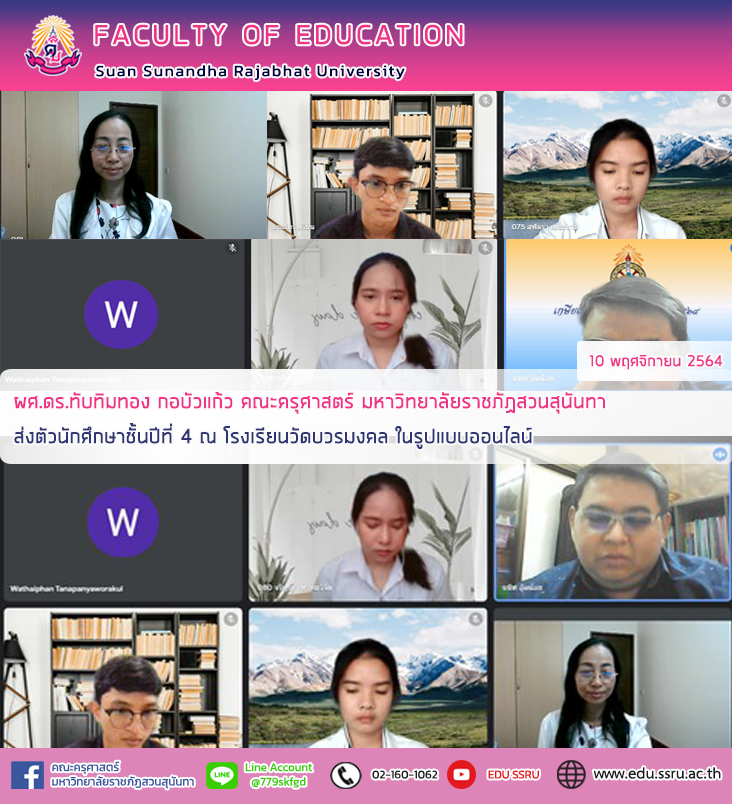 วันที่ 10 พฤศจิกายน 2564 เวลา 13.00 น. ผู้ช่วยศาสตราจารย์ ดร.ทับทิมทอง กอบัวแก้วอาจารย์ประจำสาขาวิชาเทคโนโลยีดิจิทัลเพื่อการศึกษา นิเทศประจำโรงเรียน ส่งตัว นศ.ชั้นปีที่ 4 สาขาคณิตศาสตร์ 2 คน สาขาภาษาอังกฤษ 1 คน เข้าสังเกตการณ์การสอน ณ โรงเรียนวัดบวรมงคล ในรูปแบบออนไลน์