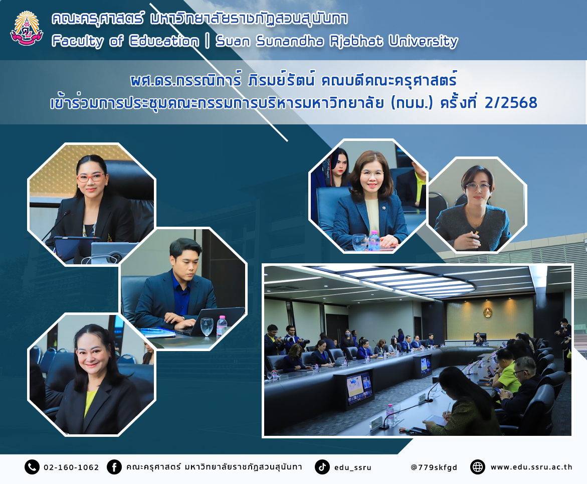 วันที่ 10 กุมภาพันธ์ 2568 เวลา 08.30 - 12.00 น. ผู้ช่วยศาสตราจารย์ ดร.กรรณิการ์ ภิรมย์รัตน์ คณบดีคณะครุศาสตร์ และนางสาววิมล รักรี รักษาการในตำแหน่งหัวหน้าสำนักงาน คณะครุศาสตร์ มหาวิทยาลัยราชภัฏสวนสุนันทา เข้าร่วมการประชุมคณะกรรมการบริหารมหาวิทยาลัยราชภัฏสวนสุนันทา (ก.บ.ม.) ครั้งที่ 2/2568 โดยมี รองศาสตราจารย์ ดร.ชุติกาญจน์ ศรีวิบูลย์ อธิการบดีมหาวิทยาลัยราชภัฏสวนสุนันทา เป็นประธานการประชุม ณ ห้องประชุมสภามหาวิทยาลัย อาคาร 31 ชั้น 5