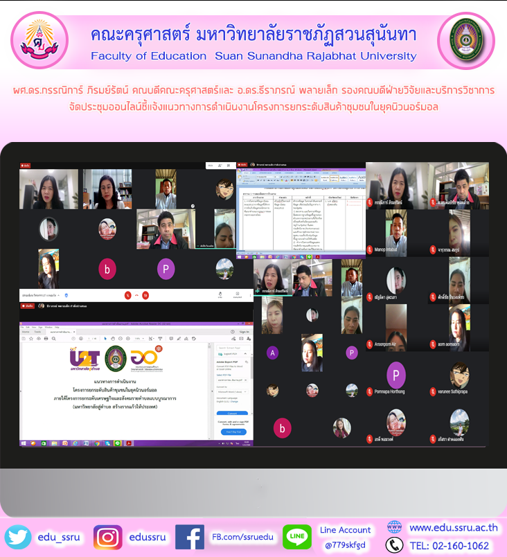 วันที่ 1 มีนาคม 2564 ผู้ช่วยศาสตราจารย์ ดร.กรรณิการ์ ภิรมย์รัตน์ คณบดีคณะครุศาสตร์ อาจารย์ ดร.ธีราภรณ์ พลายเล็ก รองคณบดีฝ่ายวิจัยและบริการวิชาการ และอาจารย์ ดรศิลป์ชัย พูลคล้าย รองคณบดีฝ่ายบริหาร มหาวิทยาลัยราชภัฏสวนสุนันทา จัดประชุมออนไลน์ชี้แจ้งแนวทางการดำเนินงานโครงการยกระดับสินค้าชุมชนในยุคนิวนอร์มอล ภายใต้โครงการยกระดับเศรษฐกิจและสังคมรายตำบลแบบบูรณาการ