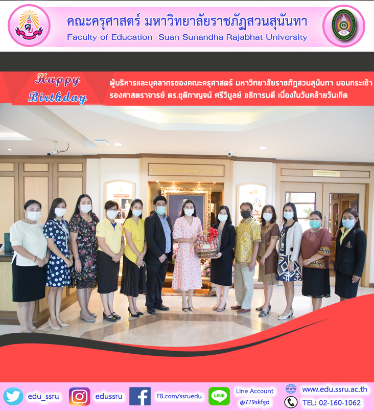วันที่ 1 มีนาคม 2564 คณะครุศาสตร์ มหาวิทยาลัยราชภัฏสวนสุนันทา นำโดย ผู้ช่วยศาสตราจารย์ ดร.กรรณิการ์ ภิรมย์รัตน์ คณบดีคณะครุศาสตร์ พร้อมด้วยบริหารและบุคลากรของคณะฯ มอบกระเช้าให้แก่ รองศาสตราจารย์ ดร.ชุติกาญจน์ ศรีวิบูลย์ อธิการบดี เนื่องในวันคล้ายวันเกิด ณ สำนักงานอธิการบดี