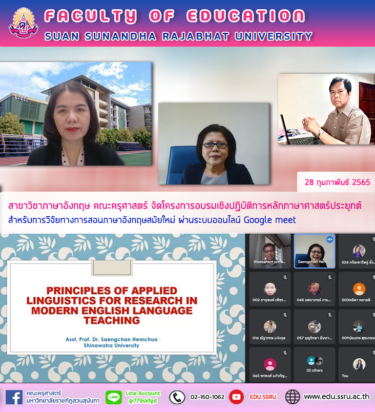 วันที่ 1 มีนาคม 2565 อาจารย์ ดร. ธรรศนันต์ อุนนะนันทน์ สาขาวิชาภาษาอังกฤษ คณะครุศาสตร์ มหาวิทยาลัยราชภัฏสวนสุนันทา จัดโครงการอบรมเชิงปฏิบัติการหลักภาษาศาสตร์ประยุกต์สำหรับการวิจัยทางการสอนภาษาอังกฤษสมัยใหม่ ภายในงานได้รับเกียรติจาก ผู้ช่วยศาสตราจารย์ ดร. กรรณิการ์ ภิรมย์รัตน์ คณบดีคณะครุศาสตร์ เป็นประธานเปิดโครงการอบรมและผู้ช่วยศาสตราจารย์ ดร. แสงจันทร์ เหมเชื้อ คณบดีคณะศิลปศาสตร์ มหาวิทยาลัยชินวัตร คณบดีคณะศิลปศาสตร์ มหาวิทยาลัยชินวัตร เป็นวิทยากร บรรยากาศภายในโครงการได้มีการบรรยายและการร่วมอภิปรายซึ่งนักศึกษาสาขาวิชาเอกภาษาอังกฤษได้ให้ความร่วมมือและมีส่วนร่วมเป็นอย่างดี โดยมีกำหนดการจัดโครงการในวันที่ 1 และ 8 มีนาคม 2565