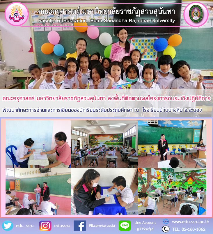 วันที่ 31 มีนาคม 2564 ผู้ช่วยศาสตราจารย์สงกรานณ์ ขุนทิพย์ทอง รองคณบดีฝ่ายกิจการนักศึกษา อาจารย์ธิดาดาว เดชศรี อาจารย์สุมนา เขียนนิล อาจารย์ประจำสาขาวิชาภาษาไทย คณะครุศาสตร์ มหาวิทยาลัยราชภัฏสวนสุนันทา ลงพื้นที่ติดตามผลโครงการอบรมเชิงปฏิบัติการพัฒนาทักษะการอ่านและการเขียนของนักเรียนระดับประถมศึกษา ณ โรงเรียนบ้านบางหิน ต.บางหิน อ.กะเปอร์ จ.ระนอง