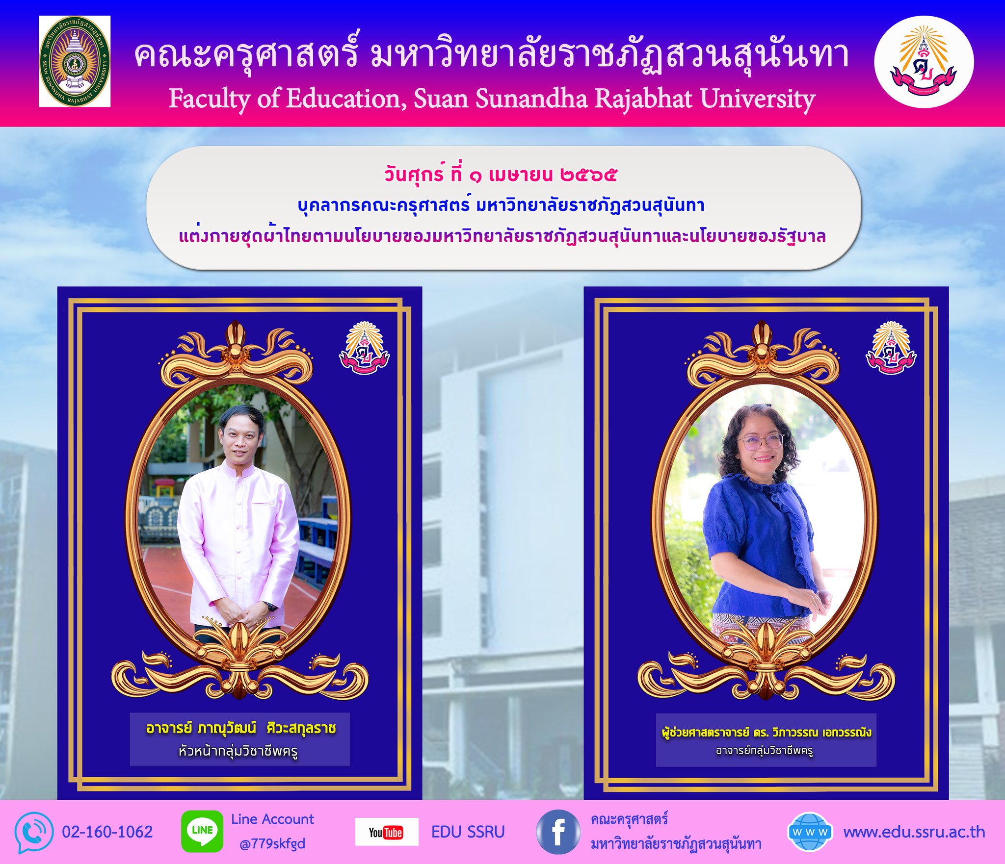 แต่งกายชุดผ้าไทยตามนโยบายของมหาวิทยาลัยราชภัฏสวนสุนันทาและนโยบายของรัฐบาล