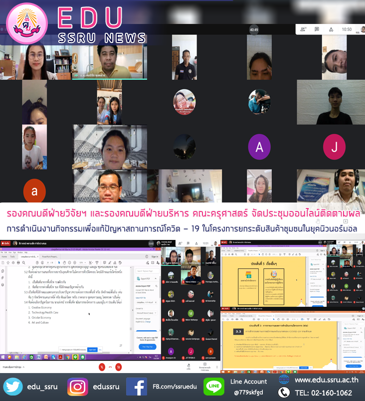 วันที่ 1 มิถุนายน 2564 ดร.ธีราภรณ์ พลายเล็ก รองคณบดีฝ่ายวิจัยและบริการวิชาการ และ ดร.ศิลป์ชัย พูลคล้าย รองคณบดีฝ่ายบริหาร คณะครุศาสตร์ มหาวิทยาลัยราชภัฏสวนสุนันทา จัดประชุมออนไลน์ติดตามผลการดำเนินงานกิจกรรมเพื่อแก้ปัญหาสถานการณ์โควิด - 19 ในโครงการยกระดับสินค้าชุมชนในยุคนิวนอร์มอล