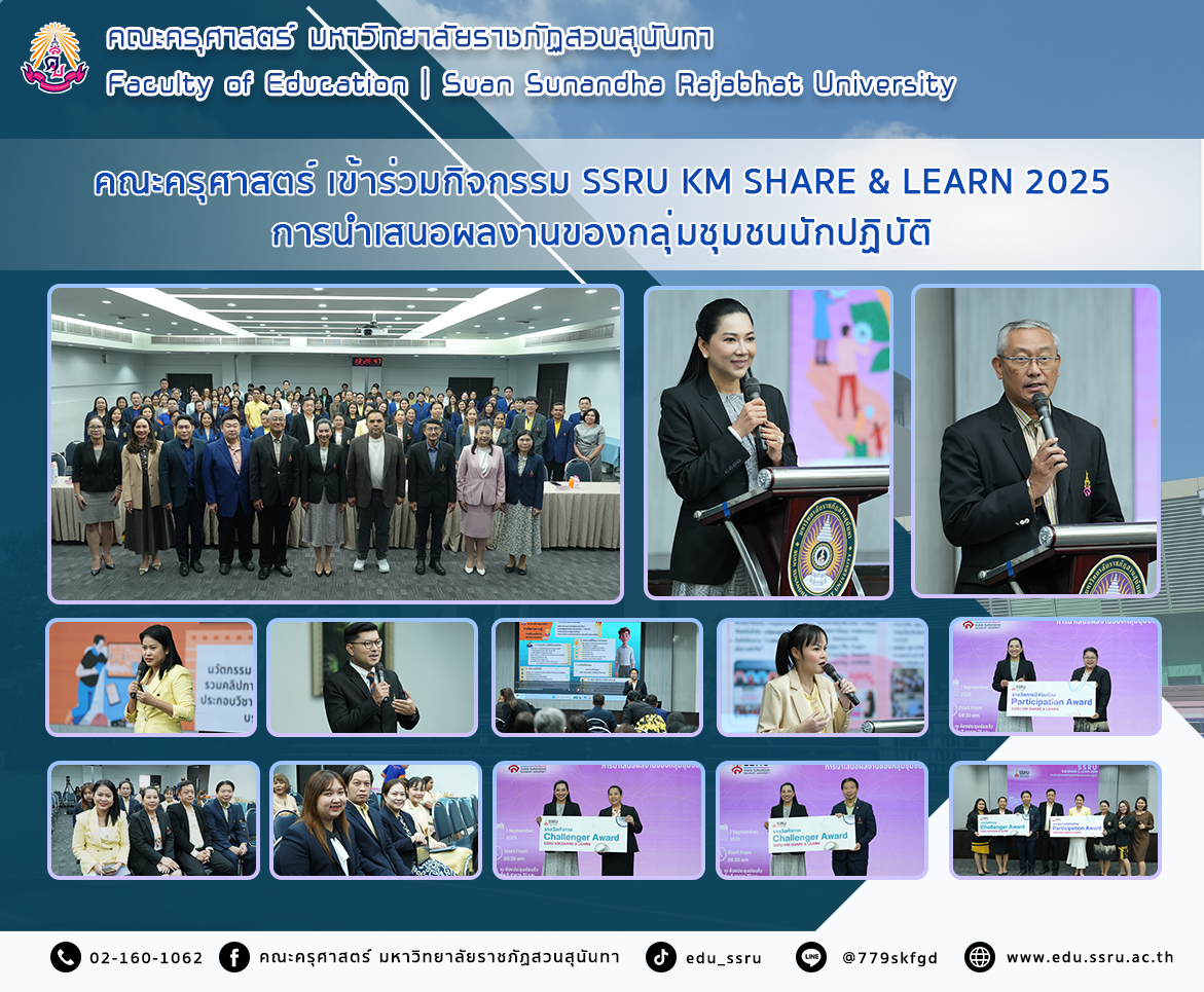 วันที่ 1 กันยายน 2568 นำโดย ผู้ช่วยศาสตราจารย์ ดร.ทัศนีย์ เศรษฐพงษ์ รองคณบดีฝ่ายวิชาการ ผู้ช่วยศาสตราจารย์ ดร. ธนวัฒน์ ศรีศิริวัฒน์ รองคณบดีฝ่ายบริหาร ผู้ช่วยศาสตราจารย์ภาณุวัฒน์ ศิวะสกุลราช รองคณบดีฝ่ายกิจการนักศึกษา ผู้ช่วยศาสตราจารย์ ดร.บุญฤดี อุดมผล รองคณบดีฝ่ายแผนงานและประกันคุณภาพ อาจารย์ ดร.ดวงกมล จงเจริญ รองคณบดีฝ่ายวิจัยและบริการวิชาการ และบุคลากรคณะครุศาสตร์ มหาวิทยาลัยราชภัฏสวนสุนันทา เข้าร่วมกิจกรรม SSRU KM Share & Learn 2025 การนำเสนอผลงานของกลุ่มชุมชนนักปฏิบัติ โดยมี รองศาสตราจารย์ ดร.ชุติกาญจน์ ศรีวิบูลย์ อธิการบดี กล่าวต้อนรับ ณ ห้องประชุมช่อแก้ว ชั้น 5 อาคาร 31 และ ระบบออนไลน์