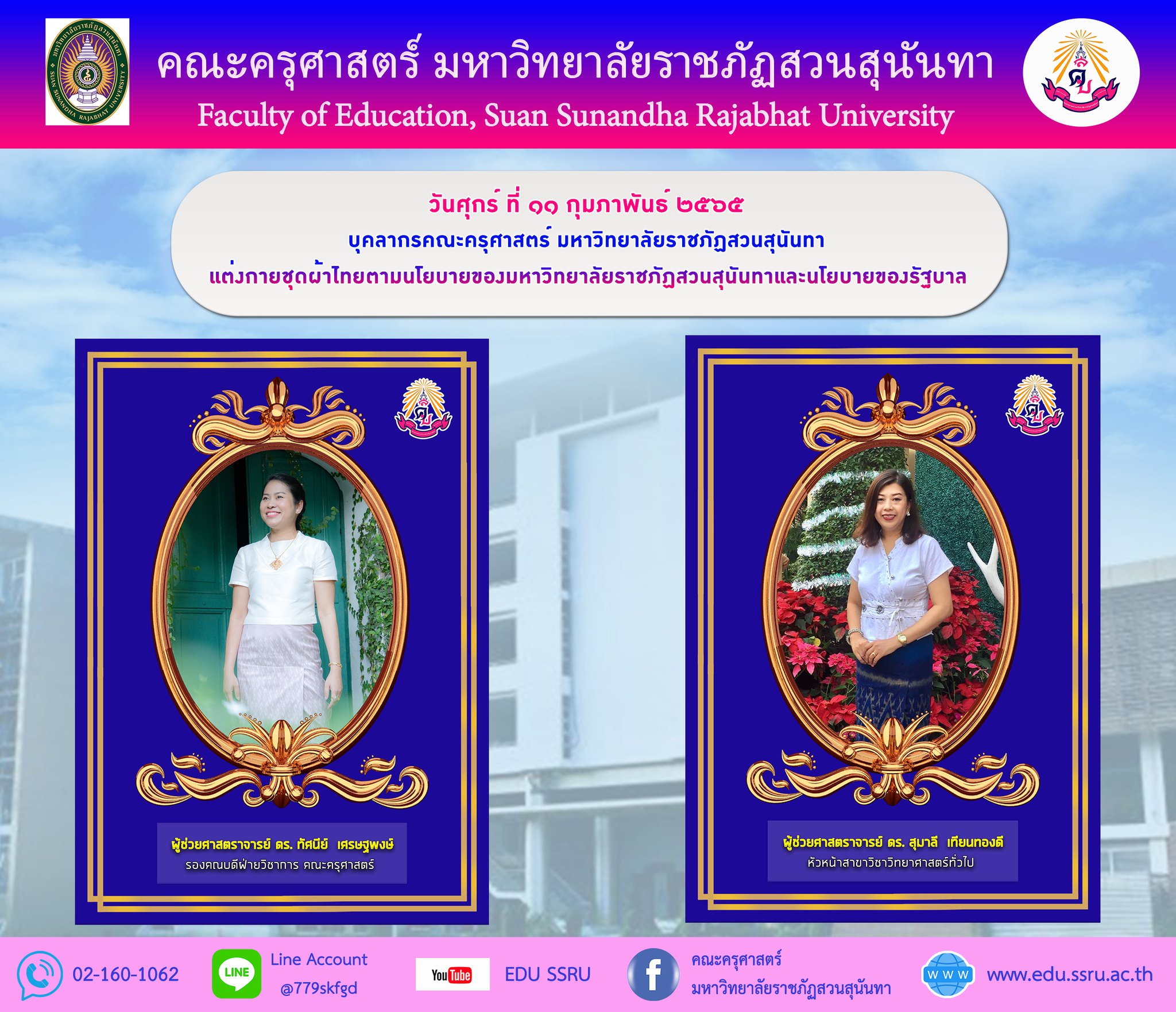 แต่งกายชุดผ้าไทยตามนโยบายของมหาวิทยาลัยราชภัฏสวนสุนันทาและนโยบายของรัฐบาล