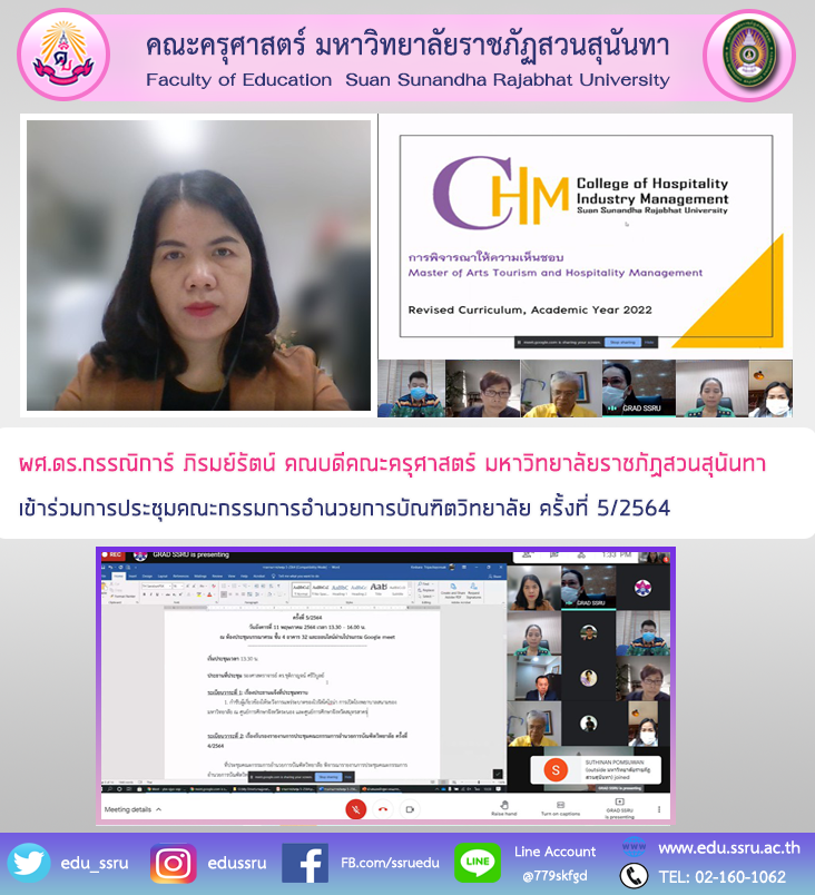 วันที่ 11 พฤษภาคม 2564 ผู้ช่วยศาสตราจารย์ ดร.กรรณิการ์ ภิรมย์รัตน์ คณบดีคณะครุศาสตร์ มหาวิทยาลัยราชภัฏสวนสุนันทา เข้าร่วมการประชุมออนไลน์คณะกรรมการอำนวยการบัณฑิตวิทยาลัย ครั้งที่ 5/2564