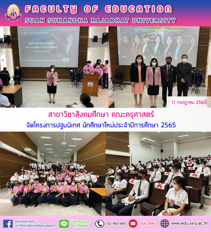 วันที่ 9 กรกฎาคม 2565 สาขาวิชาสังคมศึกษา คณะครุศาสตร์ มหาวิทยาลัยราชภัฏสวนสุนันทา จัดโครงการปฐมนิเทศ นักศึกษาใหม่ประจำปีการศึกษา 2565 โดยได้รับเกียรติจาก ผู้ช่วยศาสตราจารย์ดร.กรรณิการ์ ภิรมย์รัตน์ คณบดีคณะครุศาสตร์ และอาจารย์ประจำหลักสูตร เป็นประธานกล่าวต้อนรับ พร้อมด้วยผู้ช่วยศาสตราจารย์สงกรานณ์ ขุนทิพย์ทอง รองคณบดีฝ่ายกิจการนักศึกษาและอาจารย์ที่ปรึกษานักศึกษาชั้นปีที่ 1 าจารย์วีรพจน์ รัตนวาร รองคณบดีฝ่ายบริหารและอาจารย์ประจำหลักสูตร และอาจารย์ธีรารัตน์ ทิพย์จรัสเมธา หัวหน้าสาขาวิชาสังคมศึกษา ห้อง 1137 อาคาร 11 คณะครุศาสตร์ มหาวิทยาลัยราชภัฏสวนสุนันทา