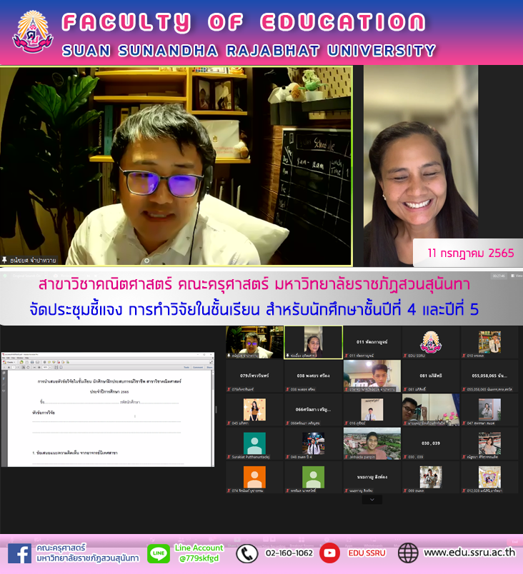 วันที่ 11 กรกฎาคม 2565 สาขาวิชาคณิตศาสตร์ คณะครุศาสตร์ มหาวิทยาลัยราชภัฏสวนสุนันทา จัดประชุมชี้แจงการทำวิจัยชั้นเรียนปีการศึกษา 2565 สำหรับนักศึกษาชั้นปีที่ 4 และปีที่ 5 ผ่านระบบออนไลน์ zoom