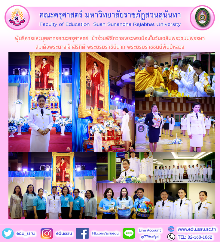 วันที่ 11 สิงหาคม 2563 คณะครุศาสตร์ มหาวิทยาลัยราชภัฏสวนสุนันทา นำโดย รองศาสตราจารย์ ดร.นันทิยา น้อยจันทร์ คณบดีคณะครุศาสตร์ ผู้ช่วยศาสตราจารย์ภาวิณี โฆมานะสิน รองคณบดีฝ่ายแผนและประกันคุณภาพและบุคลากรของคณะฯ เข้าร่วมพิธีถวายพระพรเนื่องในวันเฉลิมพระชนมพรรษา สมเด็จพระนางเจ้าสิริกิต์ พระบรมราชินีนาถ พระบรมราชชนนีพันปีหลวง เนื่องในวันคล้ายวันเฉลิมพระชนมพรรษา วันแม่แห่งชาติ 12 สิงหาคม 2563 โดยมี รศ.ดร.ชุติกาญจน์ ศรีวิบูลย์ รักษาราชการแทนอธิการบดี เป็นประธานในพิธีร่วมด้วยคณะผู้บริหารของมหาวิทยาลัย บุคลากร ณ อาคารศูนย์สุขภาพและกีฬาสวนสุนันทา ชั้น 4