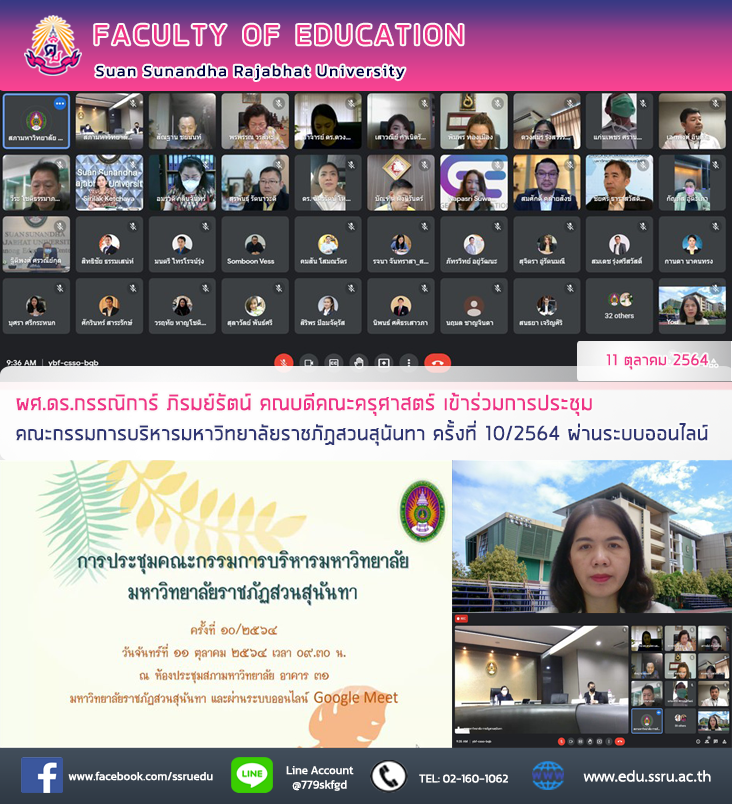 วันที่ 11 ตุลาคม 2564 ผู้ช่วยศาสตราจารย์ ดร.กรรณิการ์ ภิรมย์รัตน์ คณบดีคณะครุศาสตร์ มหาวิทยาลัยราชภัฏสวนสุนันทา เข้าร่วมการประชุม คณะกรรมการบริหารมหาวิทยาลัยราชภัฏสวนสุนันทา ครั้งที่ 10/2564 ผ่านระบบออนไลน์ โดยมีรองศาสตราจารย์ ดร.ชุติกาญจน์ ศรีวิบูลย์ อธิการบดีมหาวิทยาลัยราชภัฏสวนสุนันทา เป็นประธานการจัดประชุม