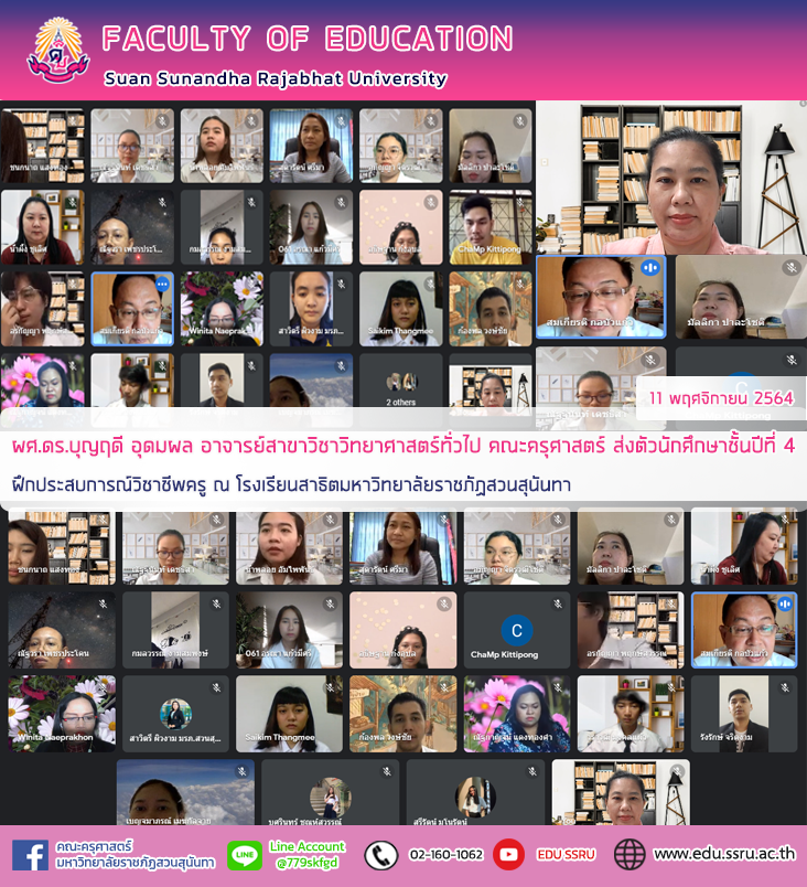 วันที่ 11 พฤศจิกายน 2564 ผู้ช่วยศาสตราจารย์ ดร.บุญฤดี อุดมผล อาจารย์สาขาวิชาวิทยาศาสตร์ทั่วไป คณะครุศาสตร์ ส่งตัวนักศึกษาชั้นปีที่ 4 ฝึกประสบการณ์วิชาชีพครู โดยได้รับเกียรติจาก รองศาสตราจารย์ ดร.สมเกียรติ กอบัวแก้ว ผู้อำนวยการโรงเรียนสาธิตมหาวิทยาลัยราชภัฏสวนสุนันทา และครูพี่เลี้ยง กล่าวต้อนรับและให้แนวปฏิบัติในการเป็นครูที่ดีกับนักศึกษา ในรูปแบบออนไลน์