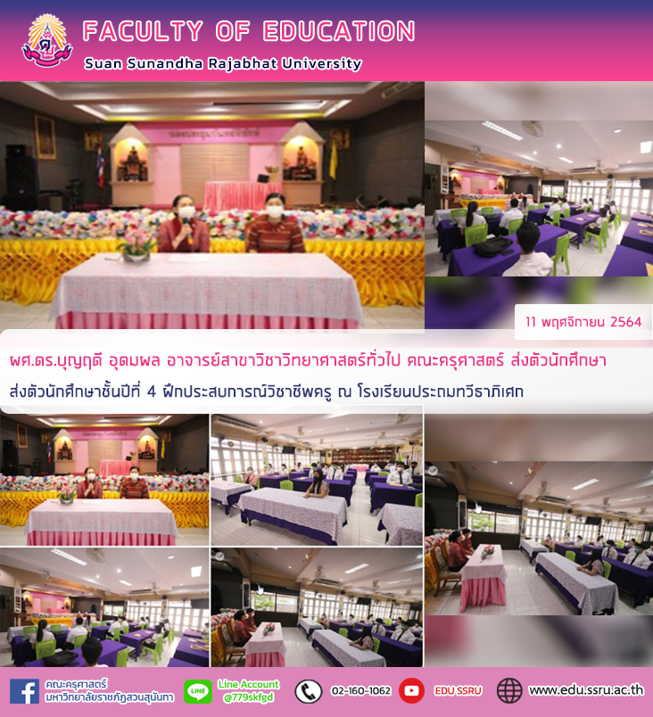 วันที่ 11 พฤศจิกายน 2564 ผู้ช่วยศาสตราจารย์ ดร.บุญฤดี อุดมผล อาจารย์สาขาวิชาวิทยาศาสตร์ทั่วไป คณะครุศาสตร์ ส่งตัวนักศึกษาส่งตัวนักศึกษาชั้นปีที่ 4 ฝึกประสบการณ์วิชาชีพครู ณ โรงเรียนประถมทวีธาภิเศก