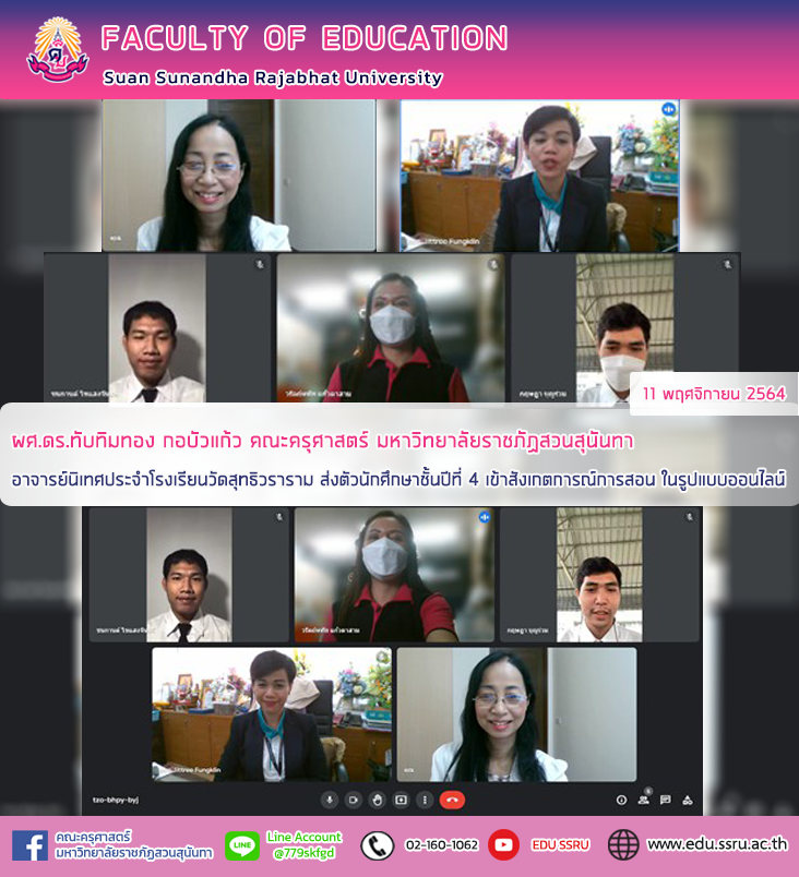 วันที่ 11 พฤศจิกายน 2564 เวลา 15.00 น. ผู้ช่วยศาสตราจารย์ ดร.ทับทิมทอง กอบัวแก้ว คณะครุศาสตร์ มหาวิทยาลัยราชภัฏสวนสุนันทา อาจารย์นิเทศประจำโรงเรียน อาจารย์นิเทศประจำโรงเรียนวัดสุทธิวราราม ส่งตัวนักศึกษาชั้นปีที่ 4 เข้าสังเกตการณ์การสอน ในรูปแบบออนไลน์