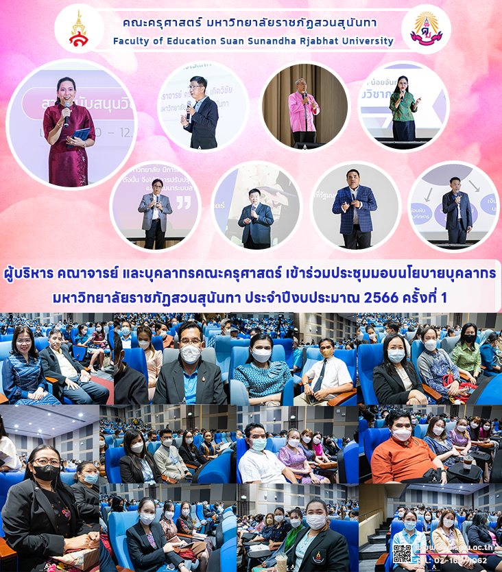 วันศุกร์ที่ 11 พฤศจิกายน 2565 เวลา 08.30 - 16.00 น. คณะครุศาสตร์ มหาวิทยาลัยราชภัฏสวนสุนันทา นำโดย ผู้ช่วยศาสตราจารย์ ดร.กรรณิการ์ ภิรมย์รัตน์ คณบดีคณะครุศาสตร์ อาจารย์วีรพจน์ รัตนวาร รองคณบดีฝ่ายบริหาร อาจารย์ ดร.ธีราภรณ์ พลายเล็ก รองคณบดีฝ่ายวิจัยและบริการวิชาการ ผู้ช่วยศาสตราจารย์สงกรานณ์ ขุนทิพย์ทอง รองคณบดีฝ่ายกิจการนักศึกษา ผู้ช่วยศาสตราจารย์ ดร.ทัศนีย์ เศรษฐพงษ์ รองคณบดีฝ่ายวิชาการ ผู้ช่วยศาสตราจารย์ ดร.บุญฤดี อุดมผลรองคณบดีฝ่ายแผนงานและประกันคุณภาพ และบุคลากรของคณะฯ เข้าร่วมประชุมมอบนโยบายบุคลากรมหาวิทยาลัยราชภัฏสวนสุนันทา ประจำปีงบประมาณ 2566 ครั้งที่ 1 โดยมี รองศาสตราจารย์ ดร.ฤๅเดช เกิดวิชัย นายกสภามหาวิทยาลัย เป็นประธานกล่าวเปิดการประชุม พร้อมด้วย รองศาสตราจารย์ ดร.ชุติกาญจน์ ศรีวิบูลย์ อธิการบดี และคณะผู้บริหารของมหาวิทยาลัย ร่วมมอบนโยบายแก่บุคลากรสายสนับสนุนวิชาการและบุคลากรสายวิชาการ ณ หอประชุมสุนันทานุสรณ์