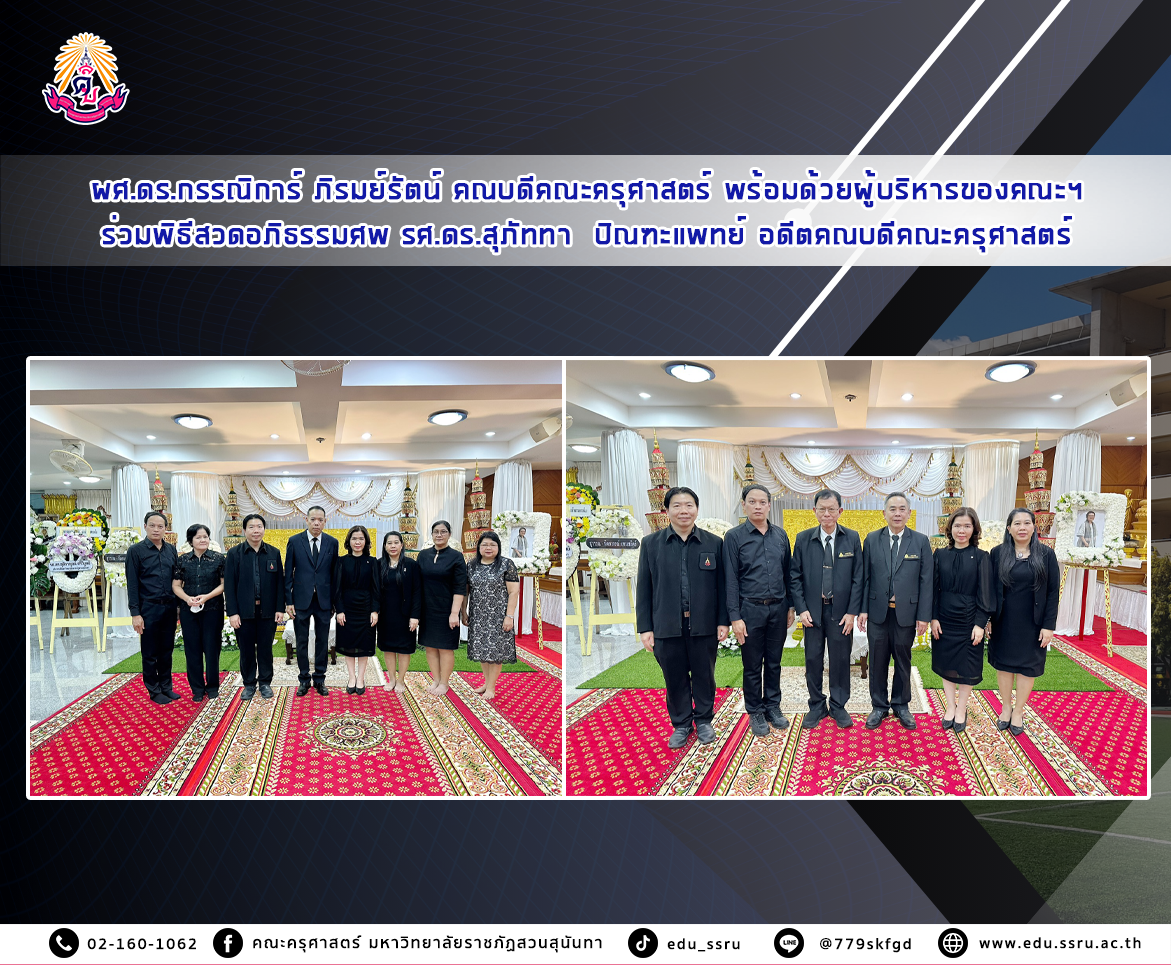 เมื่อวันที่ 8 ธันวาคม 2568 ผู้ช่วยศาสตราจารย์ ดร.กรรณิการ์ ภิรมย์รัตน์ คณบดีคณะครุศาสตร์ มหาวิทยาลัยราชภัฏสวนสุนันทา พร้อมด้วยผู้บริหารคณะฯ ร่วมพิธีสวดอภิธรรมศพ รองศาสตราจารย์ ดร.สุภัททา ปิณฑะแพทย์ อดีตคณบดีคณะครุศาสตร์ มหาวิทยาลัยราชภัฏสวนสุนันทา ณ ศาลาการเปรียญ วัดมัชฌันติการาม (วัดน้อย) ซ.วงศ์สว่าง11 แขวงวงศ์สว่าง เขตบางซื่อ กรุงเทพมหานคร