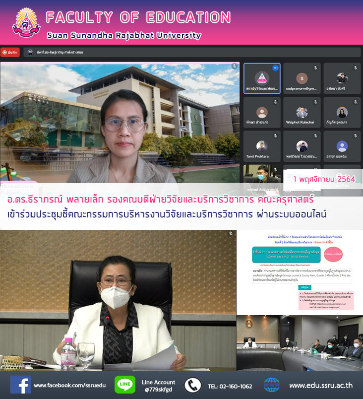 วันที่ 1 พฤศจิกายน 2564 อาจารย์ ดร.ธีราภรณ์ พลายเล็ก รองคณบดีฝ่ายวิจัยและบริการวิชาการ คณะครุศาสตร์ มหาวิทยาลัยราชภัฏสวนสุนันทา เข้าร่วมประชุมชี้คณะกรรมการบริหารงานวิจัยและบริการวิชาการ ผ่านระบบออนไลน์ เพื่อการบริหารภารกิจด้านการวิจัยและการบริการวิชาการของมหาวิทยาลัย สถาบัน และหน่วยงาน บรรลุตามเป้าหมายและตัวชี้วัดอย่างมีประสิทธิภาพ