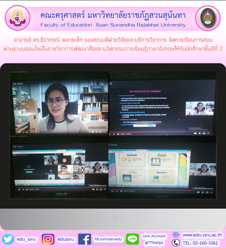วันที่ 7 มกราคม 2564 อาจารย์ ดร.ธีราภรณ์ พลายเล็ก รองคณบดีฝ่ายวิจัยและบริการวิชาการ คณะครุศาสตร์ มหาวิทยาลัยราชภัฏสวนสุนันทา จัดการเรียนการสอน ผ่านระบบออนไลน์ในรายวิชาการพัฒนาสื่อและนวัตกรรมการเรียนรู้ภาษาอังกฤษให้กับนักศึกษาสาขาวิชาภาษาอังกฤษชั้นปีที่ 2