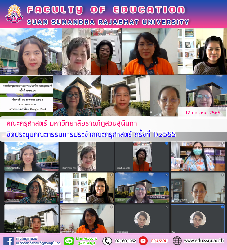 วันที่ 12 มกราคม 2565 ผู้ช่วยศาสตราจารย์ ดร.กรรณิการ์ ภิรมย์รัตน์ คณบดีคณะครุศาสตร์ มหาวิทยาลัยราชภัฏสวนสุนันทา ได้จัดประชุมคณะกรรมการประจำคณะครุศาสตร์ มหาวิทยาลัยราชภัฏสวนสุนันทา ครั้งที่ 1/2565 ผ่านทางระบบออนไลน์ Google Meet โดยได้รับเกียรติจาก ผู้ช่วยศาสตราจารย์ ดร.เตือนใจ ทองสำริต รองศาสตราจารย์ ดร.จิราภรณ์ ศิริทวี และ นางทรายทอง ตรีสัตยกุล เป็นผู้ทรงคุณวุฒิ