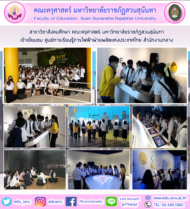 วันที่ 11 มีนาคม 2564 อาจารย์วีรพจน์ รัตนวาร และนักศึกษาชั้นปีที่ 4 สาขาวิชาสังคมศึกษา คณะครุศาสตร์ มหาวิทยาลัยราชภัฏสวนสุนันทา เข้าเยี่ยมชม ศูนย์การเรียนรู้การไฟฟ้าฝ่ายผลิตแห่งประเทศไทย สำนักงานกลาง โดยนักศึกษาได้แบ่งกลุ่มเข้าชมและร่วมทำกิจกรรมตามห้องนิทรรศการต่างๆ ณ ศูนย์การเรียนรู้การไฟฟ้าฝ่ายผลิตแห่งประเทศไทย จ.นนทบุรี