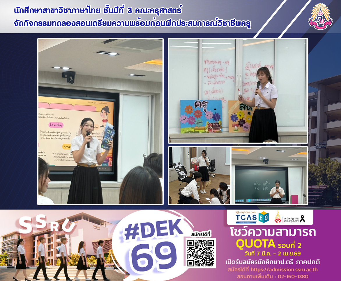 วันที่ 12 มีนาคม พ.ศ. 2569 นักศึกษาสาขาวิชาภาษาไทย ชั้นปีที่ 3 คณะครุศาสตร์ มหาวิทยาลัยราชภัฏสวนสุนันทา จัดกิจกรรมทดลองสอน (Micro Teaching) เตรียมความพร้อมก่อนฝึกประสบการณ์วิชาชีพครู ซึ่งเป็นส่วนหนึ่งของการจัดการเรียนการสอนในรายวิชา THI3312 การจัดการเรียนรู้ภาษาไทย เพื่อพัฒนาสมรรถนะและทักษะวิชาชีพครูอย่างเข้มข้น