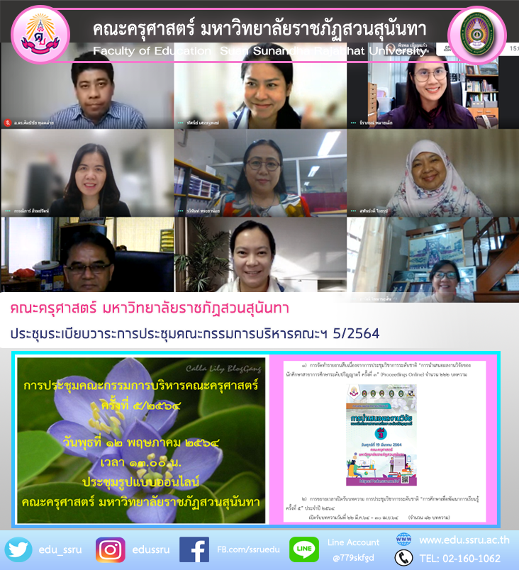 วันที่ 12 พฤษภาคม 2564 ผู้ช่วยศาสตราจารย์ ดร.กรรณิการ์ ภิรมย์รัตน์ คณบดีคณะครุศาสตร์ มหาวิทยาลัยราชภัฏสวนสุนันทา พร้อมด้วยผู้บริหารของคณะฯ เข้าร่วมการประชุมระเบียบวาระการประชุมคณะกรรมการบริหารคณะฯ ครั้งที่ 5/2564 ผ่านระบบออนไลน์