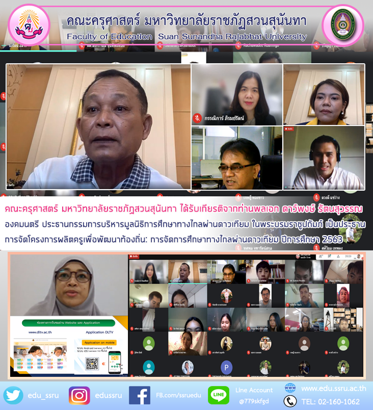 วันที่ 12 พฤษภาคม 2564 นำโดย ผู้ช่วยศาสตราจารย์สงกรานณ์ ขุนทิพย์ทอง รองคณบดีฝ่ายกิจการนักศึกษา คณะครุศาสตร์ มหาวิทยาลัยราชภัฏสวนสุนันทา จัดโครงการผลิตครูเพื่อพัฒนาท้องถิ่น ปีการศึกษา 2563 กิจกรรมการจัดการศึกษาทางไกลผ่านดาวเทียม โดยได้รับเกียรติจาก ผู้ช่วยศาสตราจารย์ ดร.กรรณิการ์ ภิรมย์รัตน์ คณบดีคณะครุศาสตร์ ดร.นงรัตน์ อิสโร อนุกรรมการด้านวิชาการ และพลเอก ดาว์พงษ์ รัตนสุวรรณ องคมนตรี ประธานกรรมการบริหารมูลนิธิการศึกษาทางไกลผ่านดาวเทียม ในพระบรมราชูปถัมภ์ กล่าวเปิดโครงการ ให้กับนักศึกษาคณะครุศาสตร์ ผ่านระบบออนไลน์