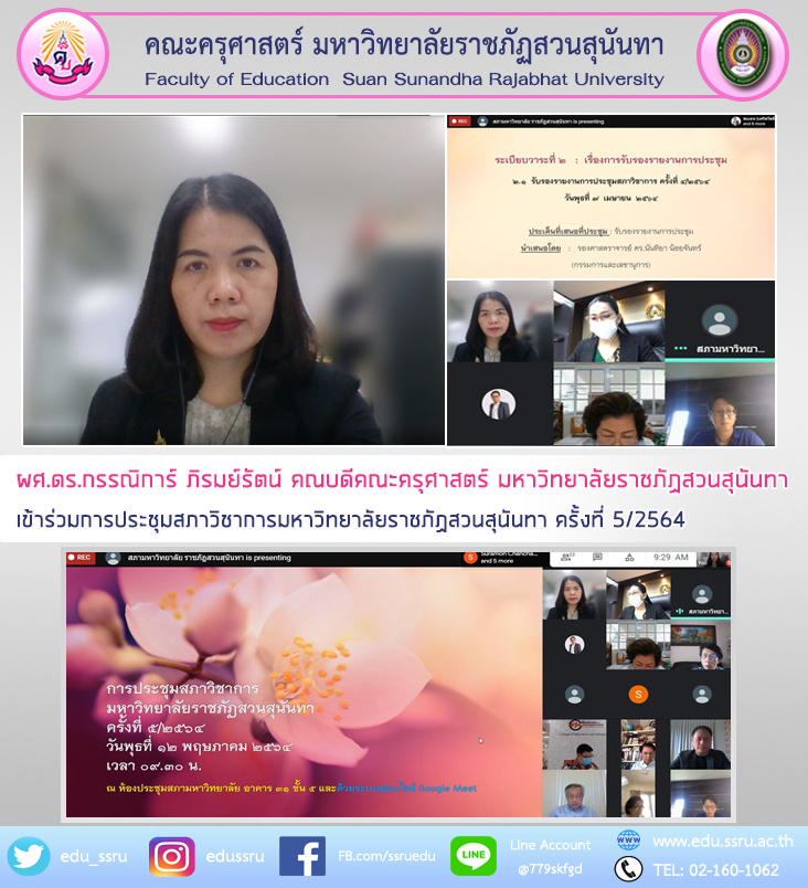 วันที่ 12 พฤษภาคม 2564 ผู้ช่วยศาสตราจารย์ ดร.กรรณิการ์ ภิรมย์รัตน์ คณบดีคณะครุศาสตร์ มหาวิทยาลัยราชภัฏสวนสุนันทา เข้าร่วมการประชุมสภาวิชาการมหาวิทยาลัยราชภัฏสวนสุนันทา ครั้งที่ 5/2564