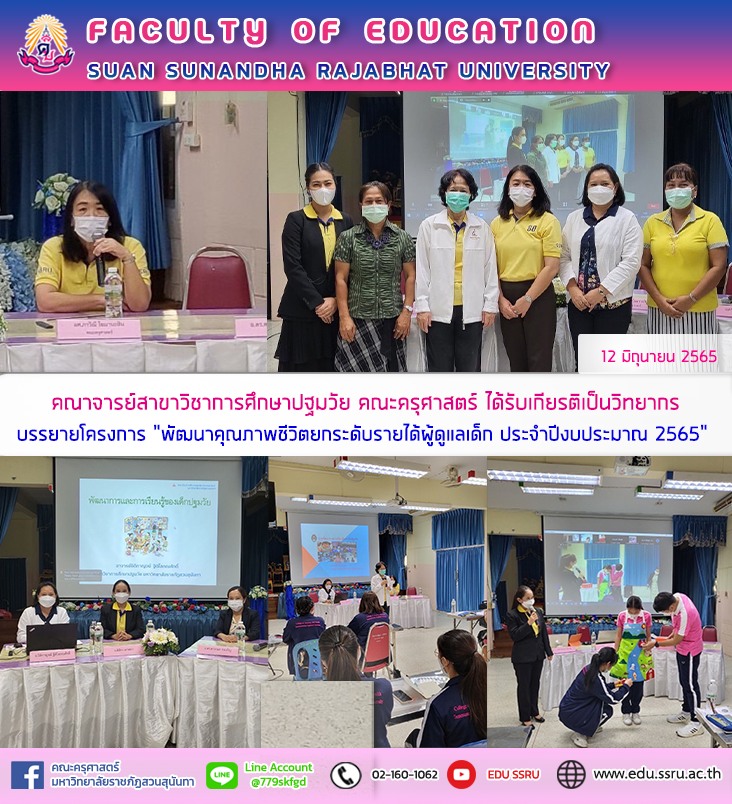 คณาจารย์สาขาวิชาการศึกษาปฐมวัย คณะครุศาสตร์ มหาวิทยาลัยราชภัฏสวนสุนันทา นำโดย ผู้ช่วยศาสตราจารย์ ภาวิณี โฆมานะสิน รองคณบดีฝ่ายแผนและประกันคุณภาพ พร้อมด้วย อาจารย์ ดร. ดวงกมล จงเจริญ ผู้อำนวยการศูนย์พัฒนาวิชาชีพ อาจารย์ ธิติกาญจน์ ฐิติโสภณศักดิ์ หัวหน้าสาขาวิชาการศึกษาปฐมวัย และ อาจารย์ ดิษิรา ผางสง่า อาจารย์ประจำสาขาวิชาการศึกษาปฐมวัย คณะครุศาสตร์ มหาวิทยาลัยราชภัฏสวนสุนันทา ได้รับเกียรติเป็นวิทยากรบรรยายโครงการ “ พัฒนาคุณภาพชีวิตยกระดับรายได้ผู้ดูแลเด็ก ประจำปีงบประมาณ 2565”
