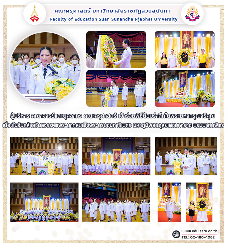 วันที่ ๑๒ ตุลาคม ๒๕๖๕ เวลา ๐๘.๐๐ น. คณะครุศาสตร์ มหาวิทยาลัยราชภัฏสวนสุนันทา นำโดย ผู้ช่วยศาสตราจารย์ ดร.กรรณิการ์ ภิรมย์รัตน์ คณบดีคณะครุศาสตร์ อาจารย์วีรพจน์ รัตนวาร รองคณบดีฝ่ายบริหาร ผู้ช่วยศาสตราจารย์ ดร.บุญฤดี อุดมผล รองคณบดีฝ่ายแผนงานและประกันคุณภาพ และ นางรวินันท์ พระยาน้อย หัวหน้าสำนักงาน พร้อมด้วยบุคลากรของคณะฯ เข้าร่วมพิธีน้อมรำลึกในพระมหากรุณาธิคุณ เนื่องในวันคล้ายวันสวรรคตพระบาทสมเด็จพระบรมชนกาธิเบศร มหาภูมิพลอดุลยเดชมหาราช บรมนาถบพิตร โดยมี รองศาสตราจารย์ ดร.ชุติกาญจน์ ศรีวิบูลย์ อธิการบดีมหาวิทยาลัยราชภัฏสวนสุนันทา เป็นประธานพิธีวางพวงมาลาน้อมรำลึกในพระมหากรุณาธิคุณ ณ อาคารศูนย์สุขภาพและกีฬาสวนสุนันทา ชั้น ๔