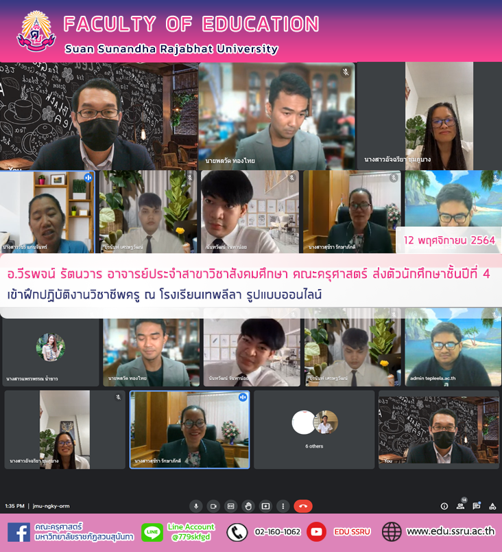 วันที่ 12 พฤศจิกายน 2564 เวลา 13.00 น. อาจารย์วีรพจน์ รัตนวาร อาจารย์ประจำสาขาวิชาสังคมศึกษา คณะครุศาสตร์ ส่งตัวนักศึกษาชั้นปีที่ 4 จำนวน 7 คน ได้แก่ นักศึกษาจากสาขาวิชาภาษาไทย 2 คน สาขาวิชาสังคมศึกษา 3 คน และสาขาวิชาเทคโนฯ 2 คน ในรูปแบบออนไลน์ เข้าฝึกปฏิบัติงานวิชาชีพครู 2 ณ โรงเรียนเทพลีลา