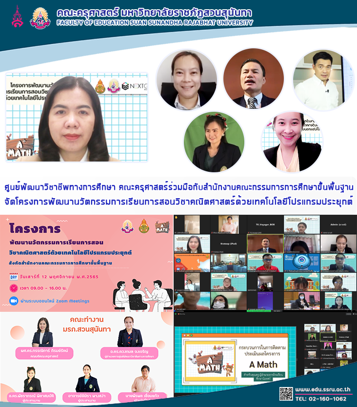 วันที่ 12 พฤศจิกายน 2565 เวลา 09.00 – 16.00 น. ศูนย์พัฒนาวิชาชีพทางการศึกษา คณะครุศาสตร์ มหาวิทยาลัยราชภัฏสวนสุนันทา นำโดย ผู้ช่วยศาสตราจารย์ ดร.กรรณิการ์ ภิรมย์รัตน์ คณบดีคณะครุศาสตร์ อาจารย์ ดร.ดวงกมล จงเจริญ ผู้อำนวยการศูนย์พัฒนาวิชาชีพทางการศึกษา อาจารย์ ดร.พัชราภรณ์ พิลาสมบัติ อาจารย์ดิษิรา ผางสง่า และนายพีรพล เชื่อมแก้ว ร่วมมือกับสำนักงานคณะกรรมการการศึกษาขั้นพื้นฐาน จัดโครงการพัฒนานวัตกรรมการเรียนการสอนวิชาคณิตศาสตร์ด้วยเทคโนโลยีโปรแกรมประยุกต์ โดยได้รับเกียรติจาก ดร.ภูธร จันทะหงส์ ปุณยจรัสธรง ผู้อำนวยการสำนักพัฒนานวัตกรรมการจัดการศึกษา สำนักงานคณะกรรมการการศึกษาขั้นพื้นฐาน เป็นประธานเปิดโครงการฯ ผู้เข้าร่วมอบรม คือ ผู้บริหารสำนักงานเขตพื้นที่การศึกษา ศึกษานิเทศก์ ผู้บริหารโรงเรียน และครูผู้สอนวิชาคณิตศาสตร์ ระดับชั้นประถมศึกษาปีที่ 4-6 จากกลุ่มโรงเรียนคุณภาพ ระดับประถมศึกษา 250 โรงเรียนทั่วประเทศ ผ่านระบบออนไลน์ Zoom Meetings