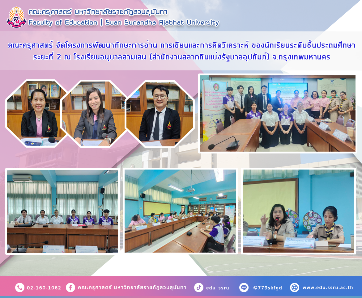 เมื่อวันที่ 11 มิถุนายน 2567 คณะครุศาสตร์ มหาวิทยาลัยราชภัฏสวนสุนันทา นำโดย ผู้ช่วยศาสตราจารย์ ดร.บุญฤดี อุดมผล รองคณบดีฝ่ายแผนงานและประกันคุณภาพ พร้อมกับคณาจารย์คณะครุศาสตร์ จัดโครงการพัฒนาทักษะการอ่าน การเขียนและการคิดวิเคราะห์ ของนักเรียนระดับชั้นประถมศึกษา ระยะที่ 2 ณ โรงเรียนอนุบาลสามเสน (สำนักงานสลากกินแบ่งรัฐบาลอุปถัมภ์) จ.กรุงเทพมหานคร