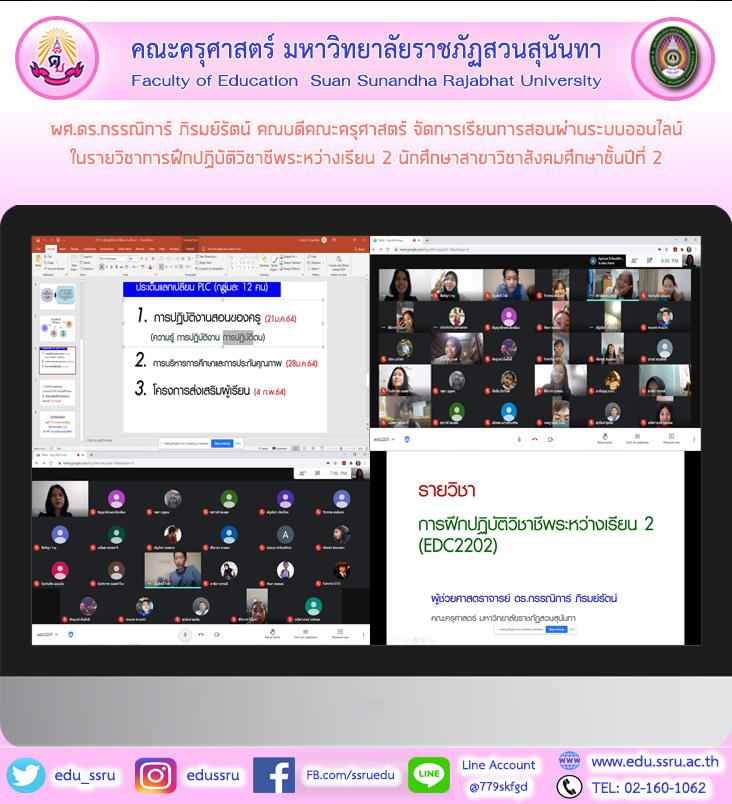 วันที่ 12 มกราคม 2564 ผู้ช่วยศาสตราจารย์ ดร.กรรณิการ์ ภิรมย์รัตน์ คณบดีคณะครุศาสตร์ มหาวิทยาลัยราชภัฏสวนสุนันทา จัดการเรียนการสอนผ่านระบบออนไลน์ ในรายวิชาการฝึกปฏิบัติวิชาชีพระหว่างเรียน 2 นักศึกษาสาขาวิชาสังคมศึกษาชั้นปีที่ 2