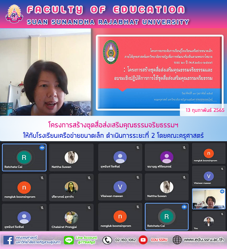 วันที่ 13 กุมภาพันธ์ 2565 เวลา 09.00 - 16.00 น. คณะครุศาสตร์ มหาวิทยาลัยราชภัฏสวนสุนันทา จัดโครงการยกระดับการเรียนรู้โรงเรียนเครือข่ายขนาดเล็ก ผ่านโครงการสร้างชุดสื่อส่งเสริมคุณธรรมจริยธรรมและอบรมเชิงปฏิบัติการการใช้ชุดสื่อส่งเสริมคุณธรรมจริยธรรม ระยะที่ 2 โดยวิทยากร คุณรัชตา ซึ้งสุนทร นำเสนอเรื่อง การทำแอนิเมชั่นด้วยโปรแกรม Powtoon การเขียนสคริปต์แอนิเมชั่น การเสริมการใช้งานแอนิแมชั่นด้วยโปรแกรม Canva การอัดเสียง และลงมือปฏิบัติการทำแอนิเมชั่นนิทานคุณธรรมจริยธรรม ผ่านระบบออนไลน์