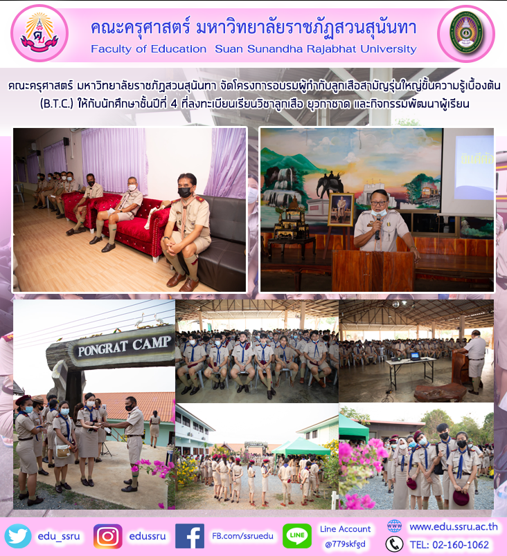 วันที่ 12 - 15 มีนาคม 2564 คณะครุศาสตร์ มหาวิทยาลัยราชภัฏสวนสุนันทา จัดโครงการอบรมผู้กำกับลูกเสือสามัญรุ่นใหญ่ขั้นความรู้เบื้องต้น (B.T.C.) ให้กับนักศึกษาชั้นปีที่ 4 ที่ลงทะเบียนเรียนวิชาลูกเสือ ยุวกาชาด และกิจกรรมพัฒนาผู้เรียน เพื่อให้มีความรู้ความเข้าใจเกี่ยวกับกิจการลูกเสือโดยทั่วไป สามารถปฏิบัติได้เกี่ยวกับทักษะและพิธีการลูกเสือ และนำความรู้ที่ได้จากการอบรมไปใช้ให้เกิดประโยชน์แก่ตัวเองและกิจการลูกเสือ ณ ค่ายลูกเสือพงศ์รัตน์ ตำบลหนองกุ่ม อำเภอบ่อพลอย จังหวัดกาญจนบุรี