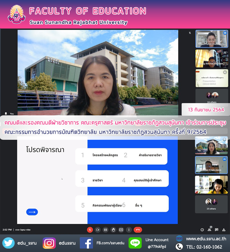 วันที่ 13 กันยายน 2564 ผู้ช่วยศาสตราจารย์ ดร.กรรณิการ์ ภิรมย์รัตน์ คณบดี และ ผู้ช่วยศาสตราจารย์ ดร.ทัศนีย์ เศรษฐพงษ์ รองคณบดีฝ่ายวิชาการ คณะครุศาสตร์ มหาวิทยาลัยราชภัฏสวนสุนันทา เข้าร่วมการประชุมคณะกรรมการอำนวยการบัณฑิตวิทยาลัย มหาวิทยาลัยราชภัฏสวนสุนันทา ครั้งที่ 9/2564 ผ่านระบบออนไลน์